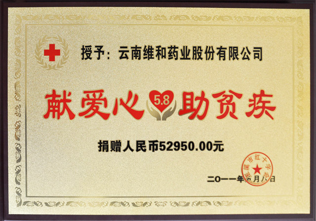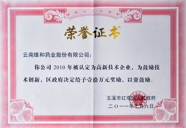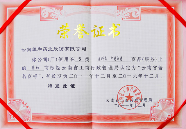 在5類(lèi)原料藥、中藥成藥商品(服務(wù))上的維和商標(biāo)經(jīng)云南省工商行政管理局認(rèn)定為“云南省著名”