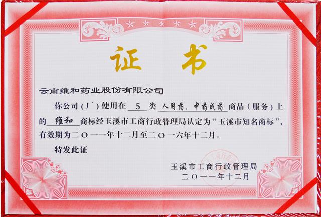 在5類人用藥、中藥成藥商品(服務(wù))上的維和商標(biāo)經(jīng)玉溪市工商行政管理局認(rèn)定為“玉溪市知名商標(biāo)”